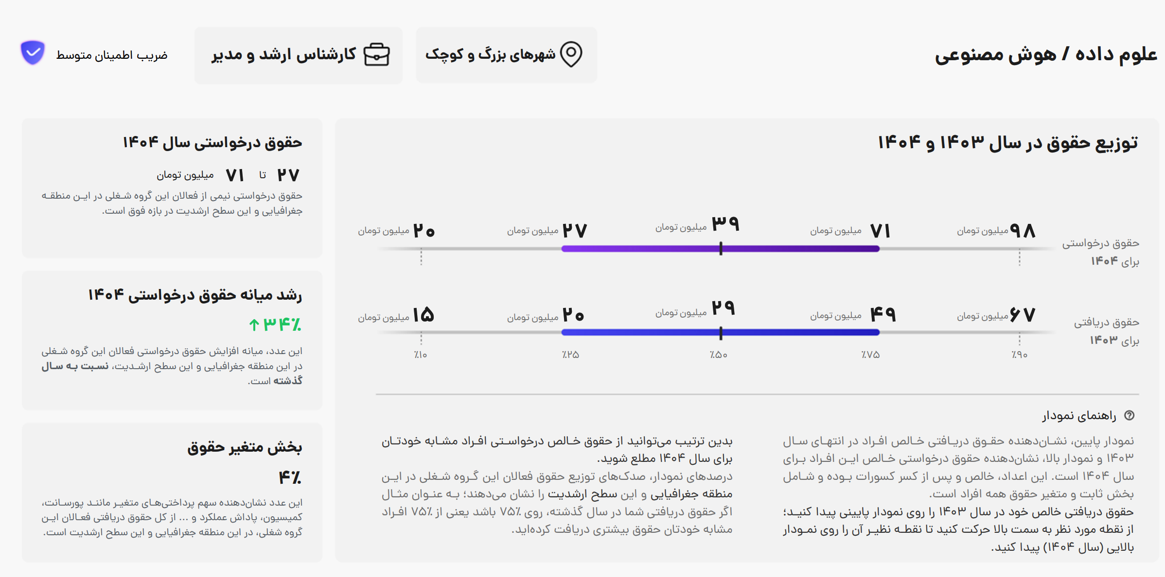تحلیل دادهها، مدلسازی پیشبینی و طراحی الگوریتمهای هوشمند، از جمله کارهای متخصصان حوزه هوش مصنوعی است. با گسترش استفاده از داده در کسبوکارها، تقاضا برای Data Scientistها و متخصصان AI به شدت افزایش یافته و این شغلها به موقعیتهای کاری با سود بالا و درآمد ارزی نیز تبدیل شدهاند. در حال حاضر میانه دریافتی افراد در این شغل ۳۹ میلیون تومان در ماه است و در برخی شرکتها و پروژهها به ۷۱ میلیون تومان نیز میرسد. اما پیشبینی میشود با توجه به اهمیت AI در دنیای امروز، برخی از متخصصان حرفهایتر حقوقهای بالاتری نیز دریافت کنند.