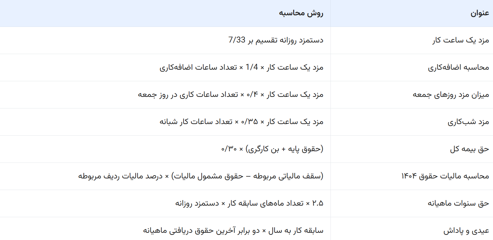 همانطور که در جدول حقوق 1405 مشاهده کردید، با توجه به افزایش حقوق در سال 1405، میزان اضافهکاری، حق بیمه، مالیات و سایر مزایا نیز دستخوش تغییر شده است. برای محاسبه دقیق این موارد، میتوان از فرمولهای زیر بهره برد:
